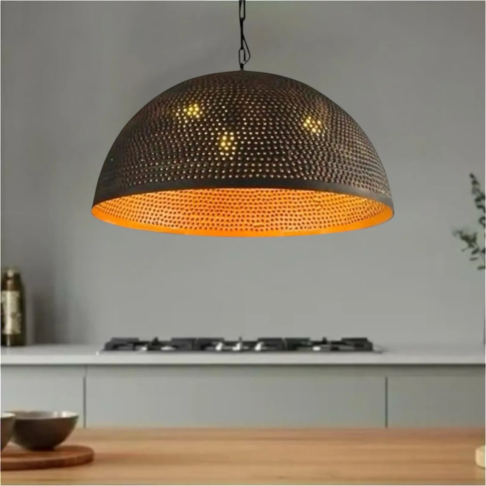 Expertly crafted by Moroccan artisans, this pendant combines a matte black exterior with a warm golden interior, creating a luxurious contrast that enhances both modern and boho-inspired spaces. Its dome shape directs light perfectly, making it ideal for kitchen islands, dining rooms, bedrooms, offices, and entryways.
