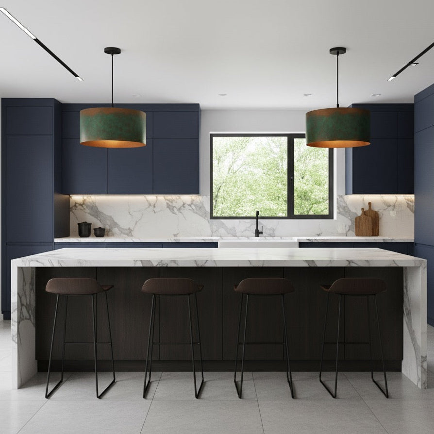 Handmade Green Patina Copper Drum Pendant – Rustic Industrial Ceiling Light – Kitchen Island Lighting Fixture