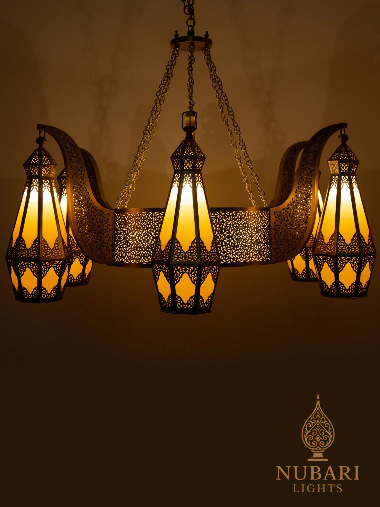 Tifrit Moroccan Brass Chandelier – Handmade Ceiling Light with Six Lanterns