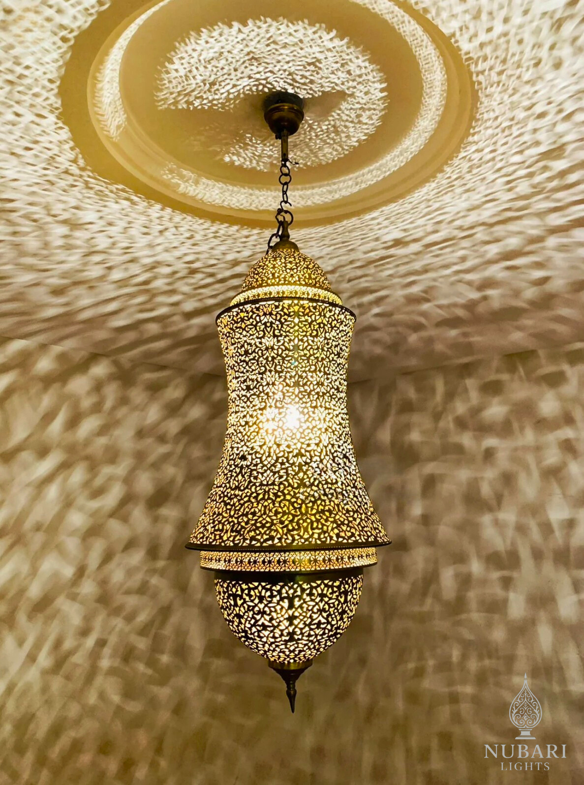 Crafted by skilled artisans in Marrakech, this elegant pendant features intricate pierced patterns that project mesmerizing oriental shadows across your walls and ceiling. A timeless piece of Moroccan design, perfect for living rooms, dining areas, entryways, bedrooms, boutique hotels, and riads.