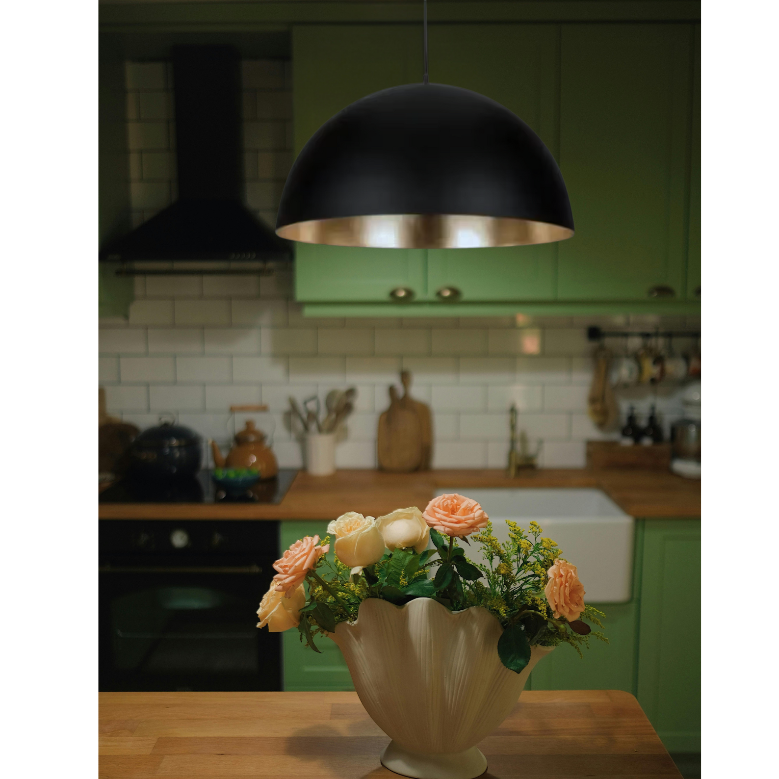 Handcrafted in Morocco, its minimalist yet striking design makes it a versatile choice for kitchens, dining areas, living rooms, or commercial spaces. The warm bronze finish adds depth and sophistication, while the dome shape provides both style and functional lighting.