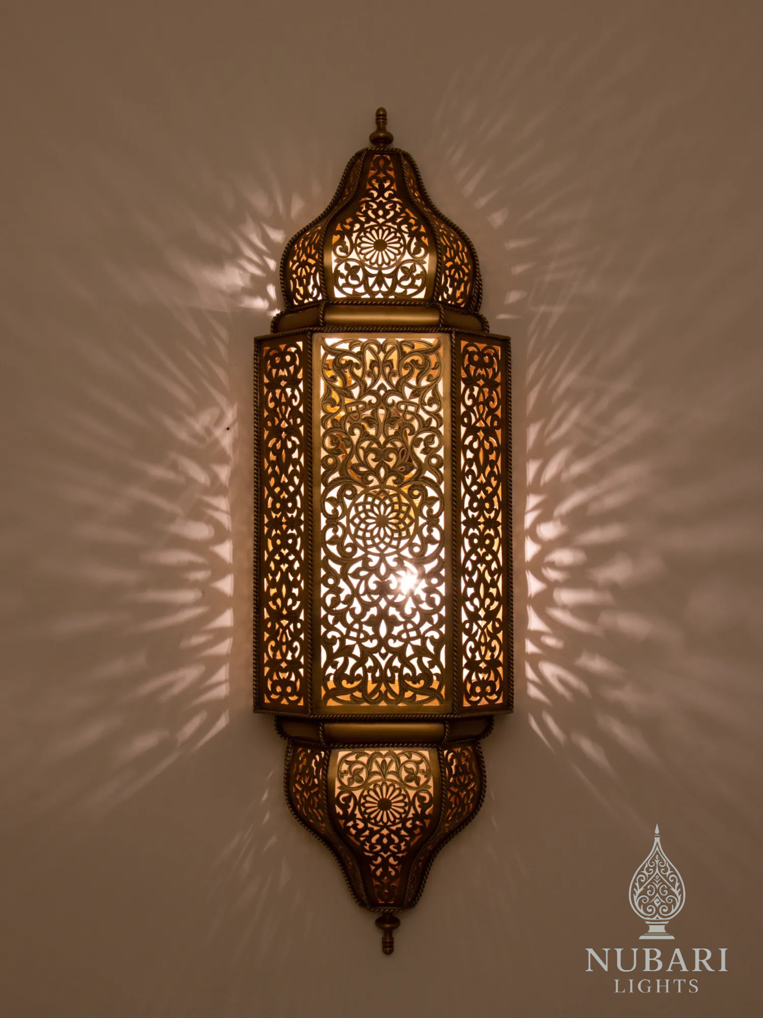 This handmade brass wall lantern is meticulously pierced by skilled artisans in Marrakech, projecting enchanting shadow patterns across your walls. Its elongated hexagonal shape and domed top make it a true statement piece that blends tradition with elegance.